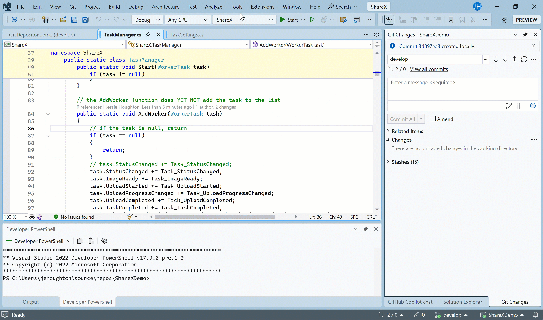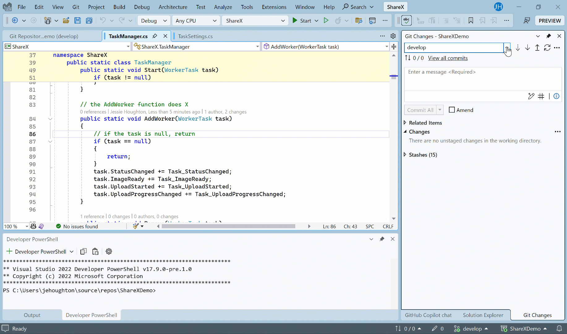 Take local code and push it to a new repository on GitHub in one step. Visual Studio handles the local and remote repository creation. You can even choose to make the repo completely private.