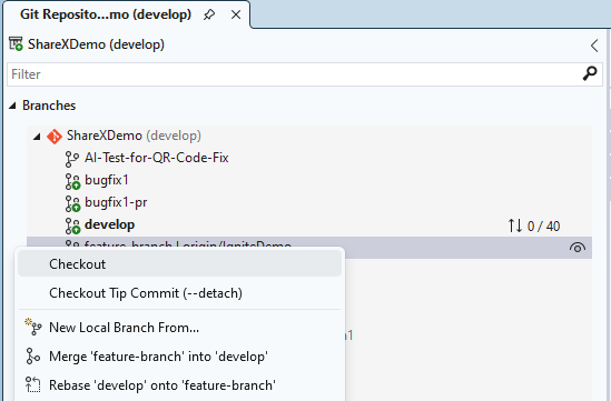 Merge or rebase branches after completing features directly from within Visual Studio. You can also choose to merge or rebase when pulling, or prune branches when fetching.